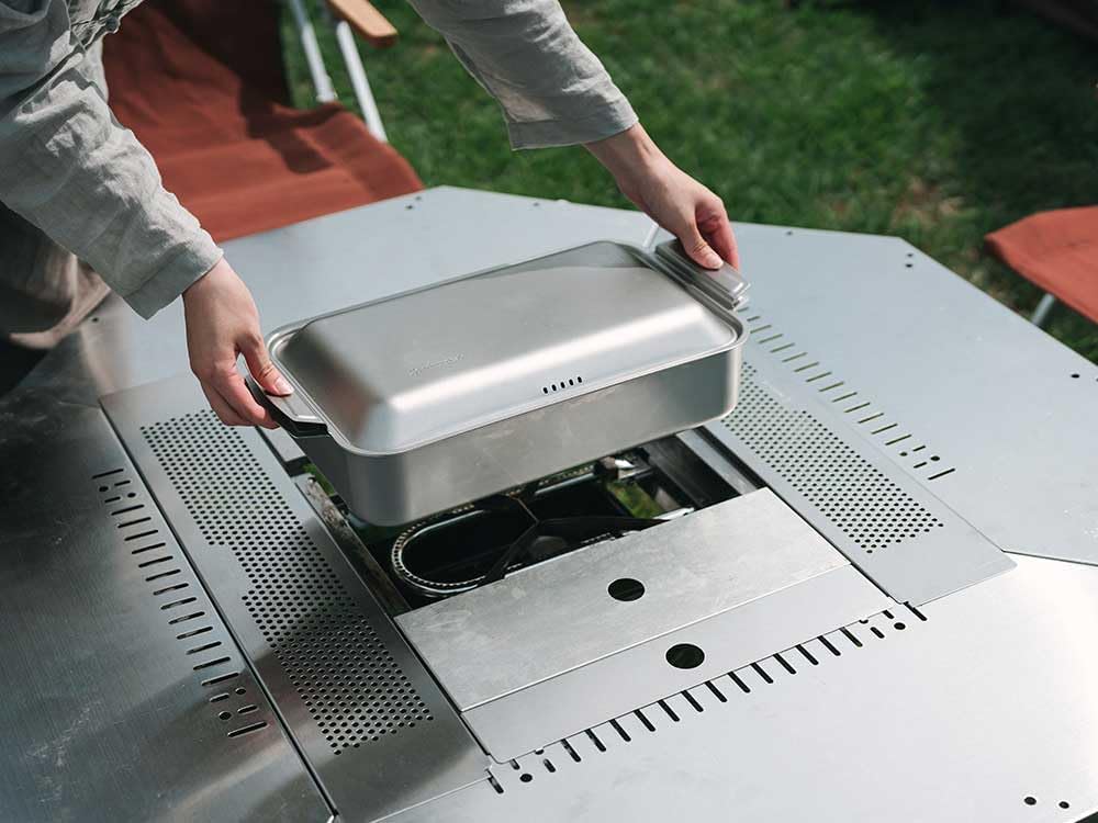 The SNOW PEAK Seppouen Oden Hotpot FES-357 is a premium, limited-edition stainless steel cooking pot created for the discerning outdoor chef. Designed for the Snow Peak Festival Autumn 2023, this rectangular hotpot is engineered for multi-functional outdoor cooking—perfect for simmering traditional Japanese oden, steaming vegetables, or boiling stews. Its deep interior holds ample ingredients, while smart accessories like a partition plate and steaming net enable versatile use. With robust stainless steel construction and an innovative reversible lid that doubles as a tray, this pot delivers both functionality and elegance in outdoor cookware.